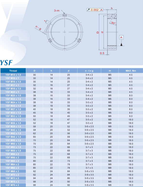 YSF系列精密鎖緊螺母鎖定方式為螺紋半角30°角三點(diǎn)式鎖定,其優(yōu)異的鎖定設(shè)計(jì),能使固定銅上之螺紋,完全契合于公螺紋上,使其防松效果完美無(wú)缺更因?yàn)槠?0°角的設(shè)計(jì)。